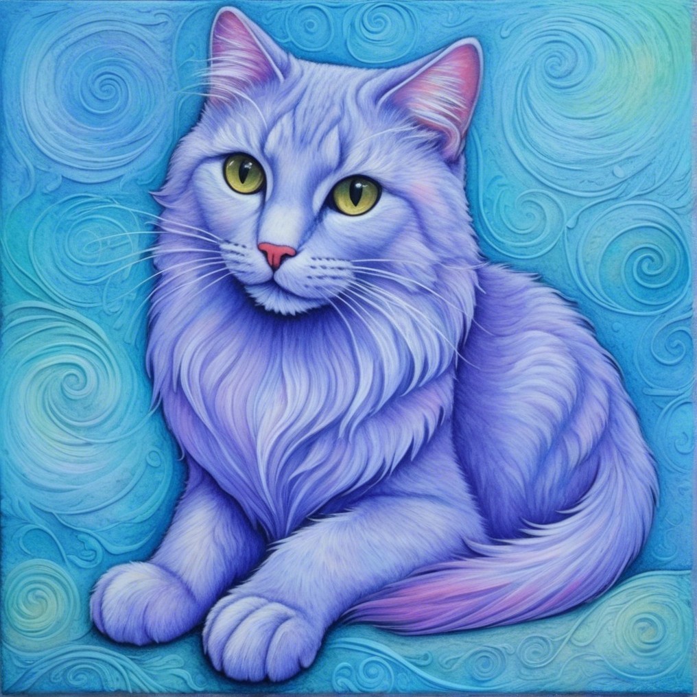 A whimsical painting of a fluffy light blue cat with striking yellow eyes, set against a swirling turquoise background, exuding a playful and vibrant charm.