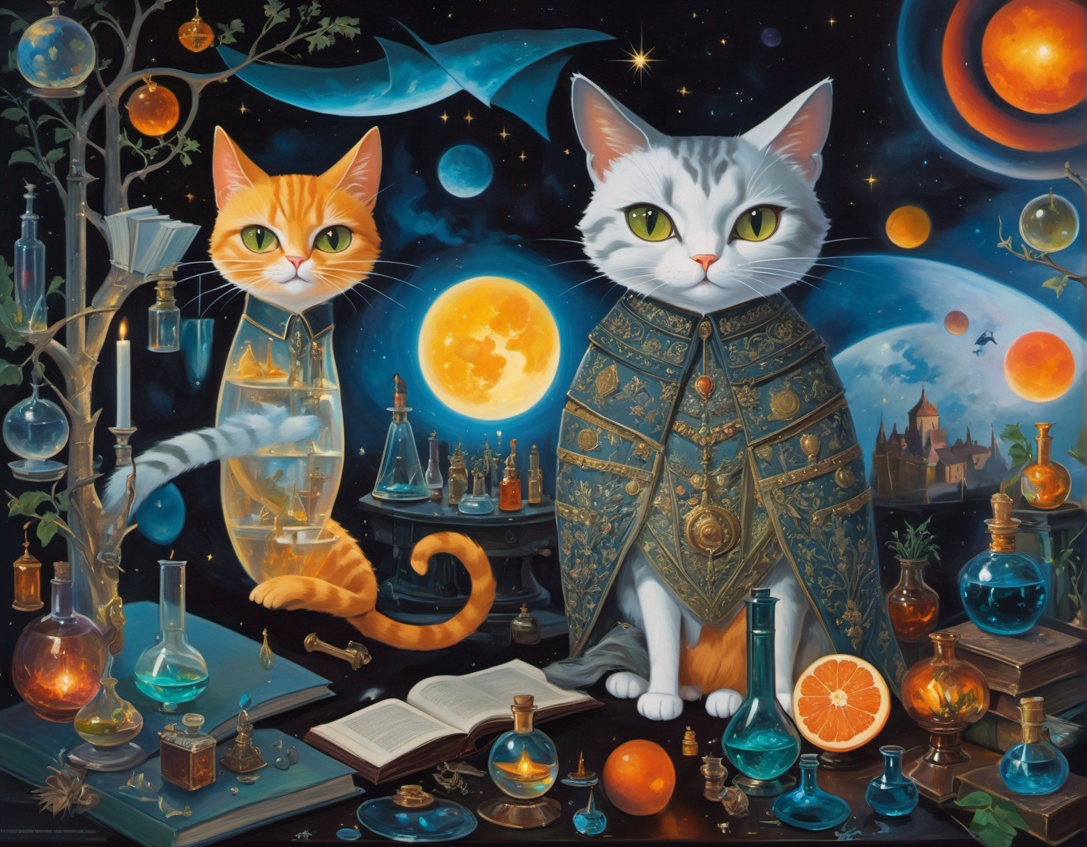 Wizard with long beard in magical library with floating lights, candles, books, potions, and white cat