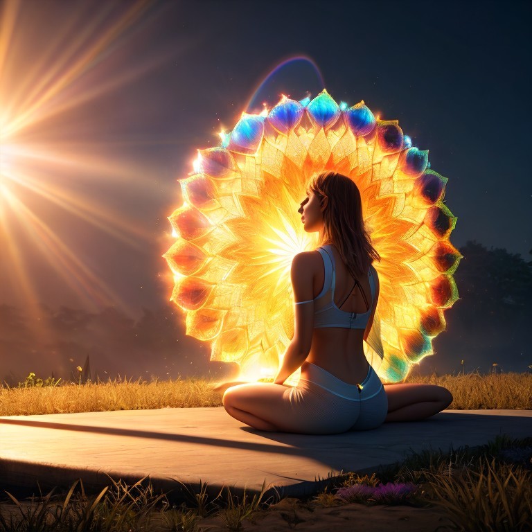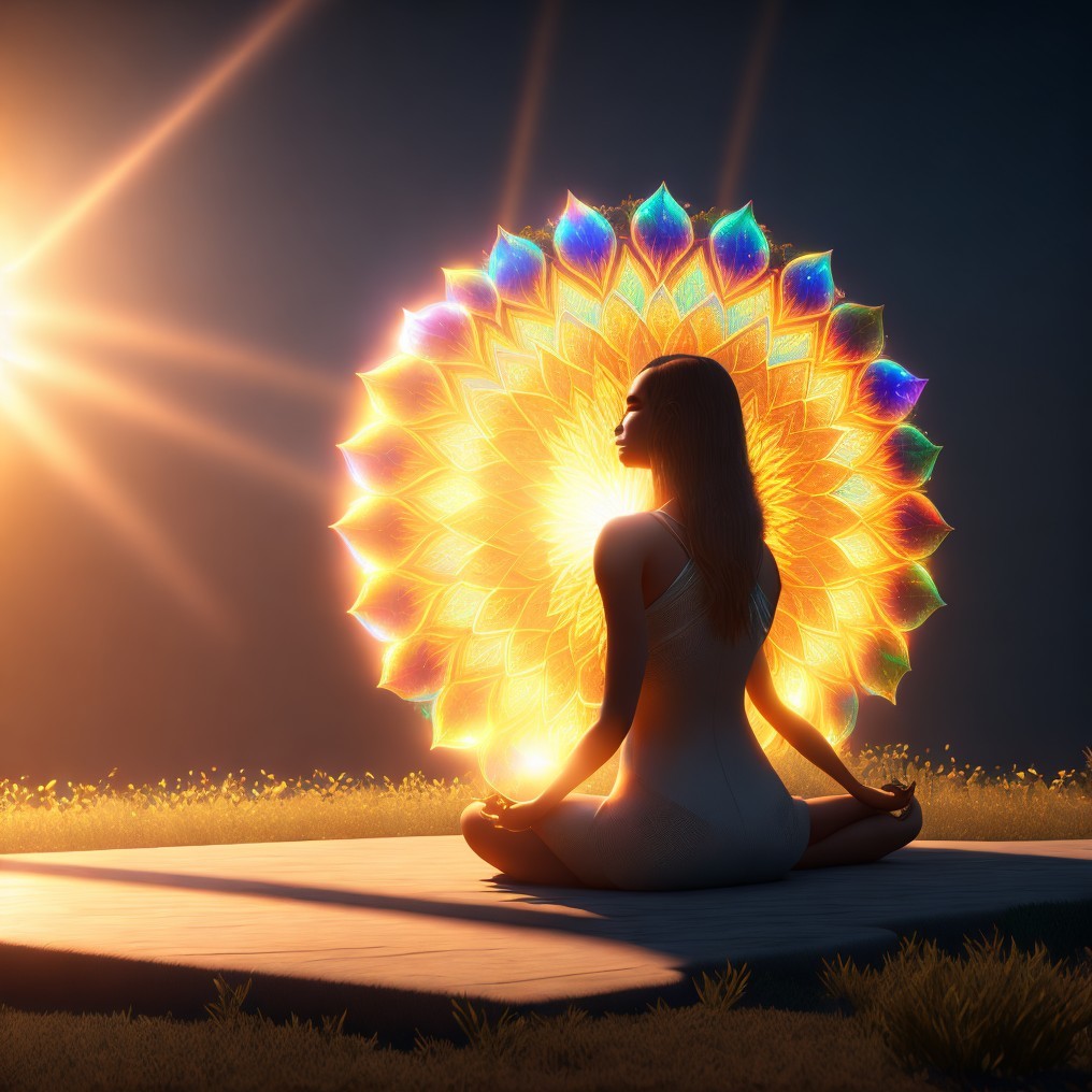 Prompt: prismatic sun rays illuminating the person below meditating on the ground Hyperrealistic, 8K resolution 64 megapixels, Intricately Detailed, Dynamic Lighting, Unreal Engine 5, CryEngine, Trending on ArtStation, HDR, 3D Masterpiece, Unity Render, Perfect Composition,