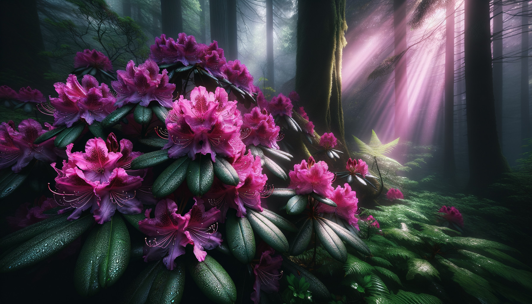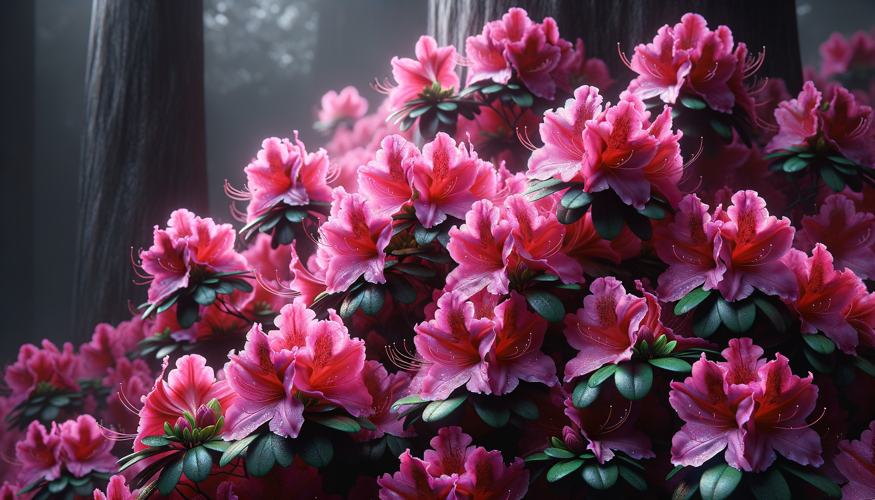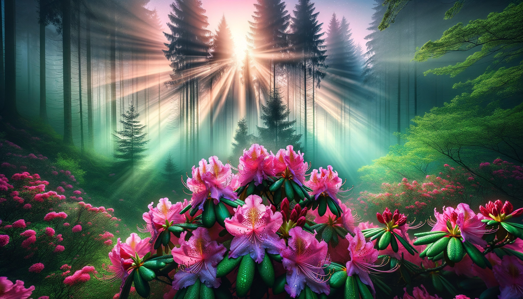 Vibrant illustration of lush flowers in the foreground with a radiant sun shining through tall, dark pine trees.