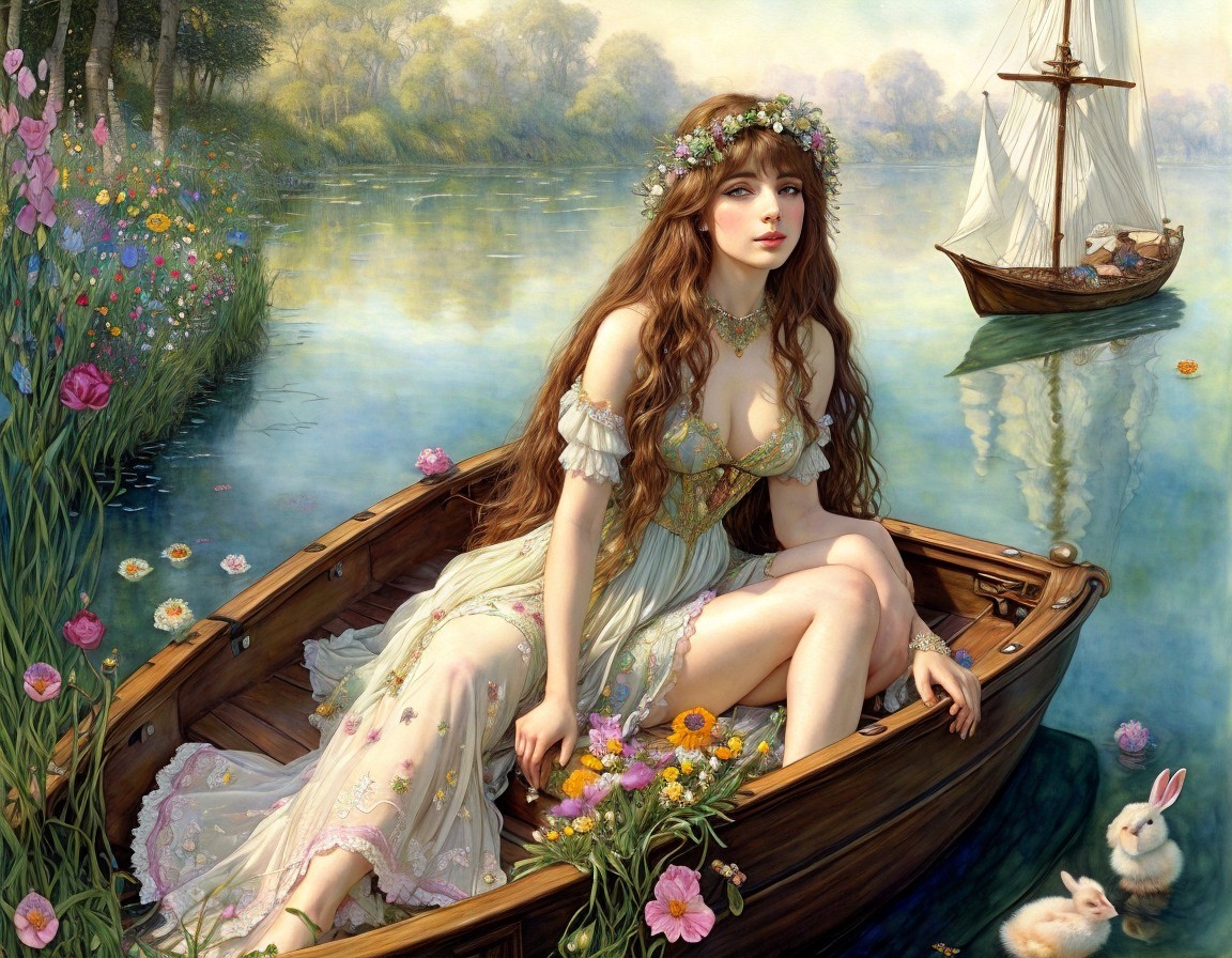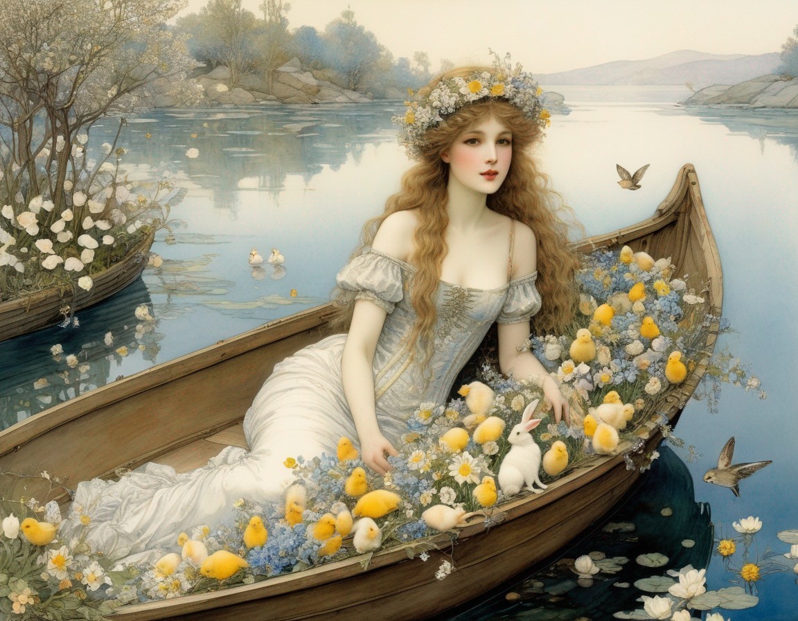 A woman in a pastoral dress reclines in a boat adorned with flowers, accompanied by a white rabbit, amidst a serene lake setting.