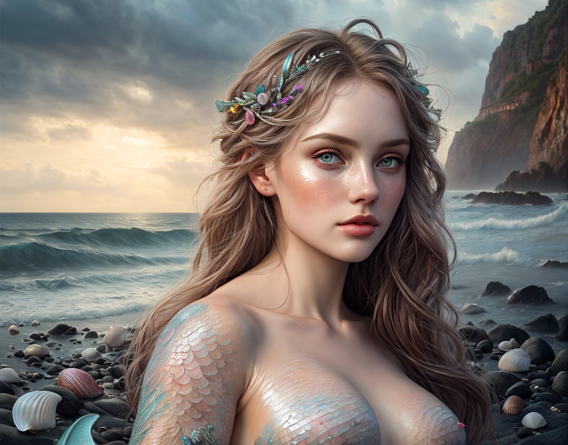 Beautiful mermaid with high detailed scales on a beach with small stones and shells by the sea Stormy and high waves, painting style by Agnieszka Lorek, john William Waterhouse, panorama view.