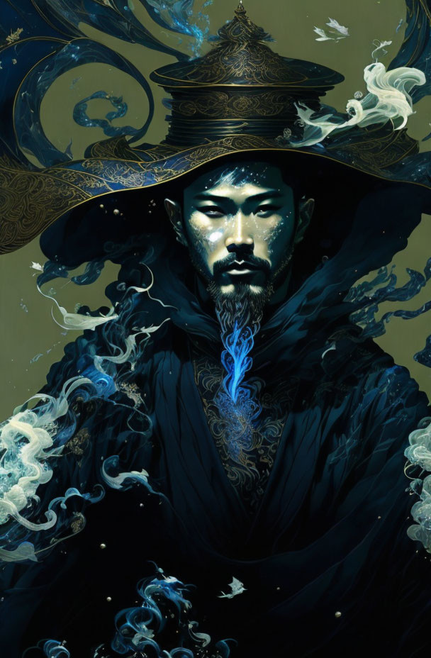 Bearded male figure in dark robes with ornate hat, surrounded by blue smoke and golden accents