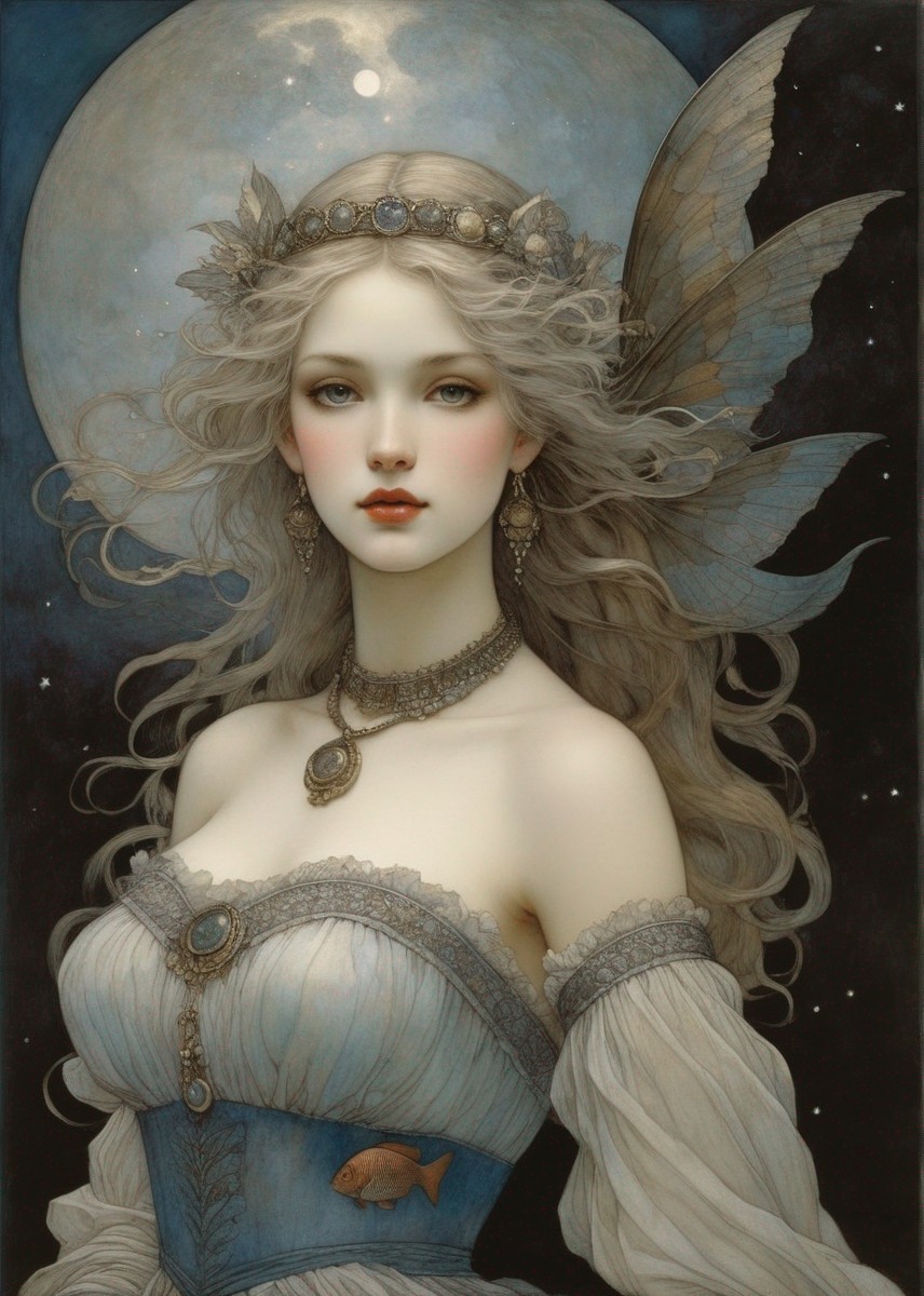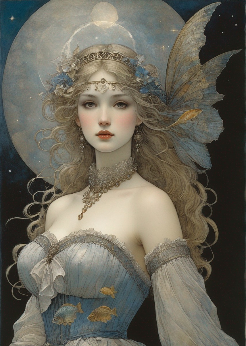 Prompt: Haliae, keeper of the school of fishes.She had been born with a face that would let her get her way.She walks in beauty, like the night . Of cloudless climes and starry skies; And all that’s best of dark and bright Meet in her aspect and her eyes;