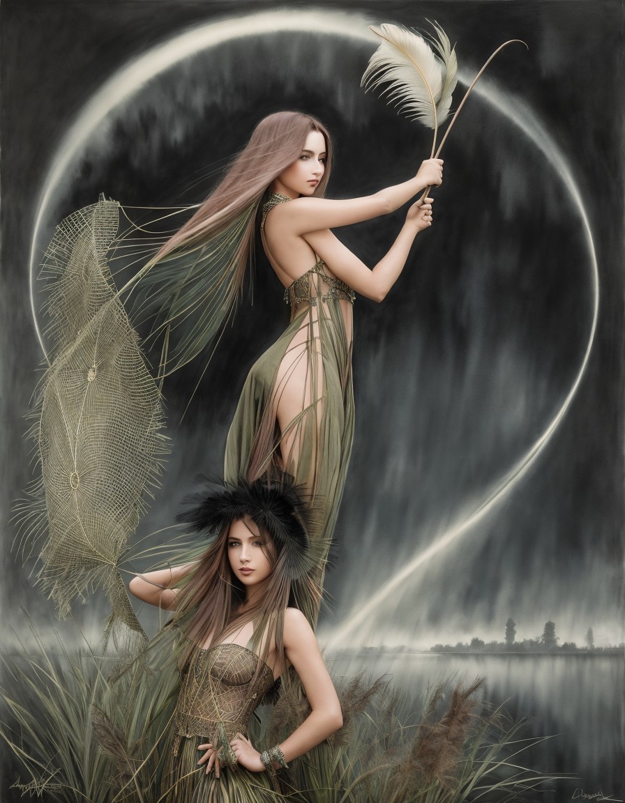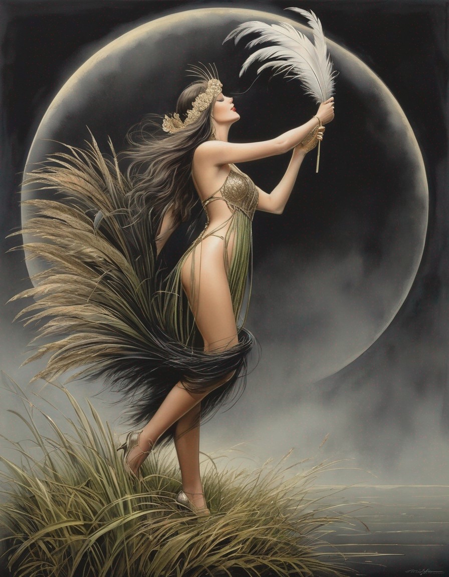 An elegant woman in a flowing beige dress and a feathered headpiece stands holding a staff, exuding grace and vintage glamour.