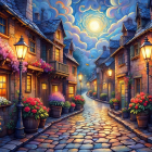 A charming cobblestone street is lined with quaint houses adorned with vibrant flowers and glowing lanterns. The scene is illuminated by a soft moonlight, creating a magical evening atmosphere.