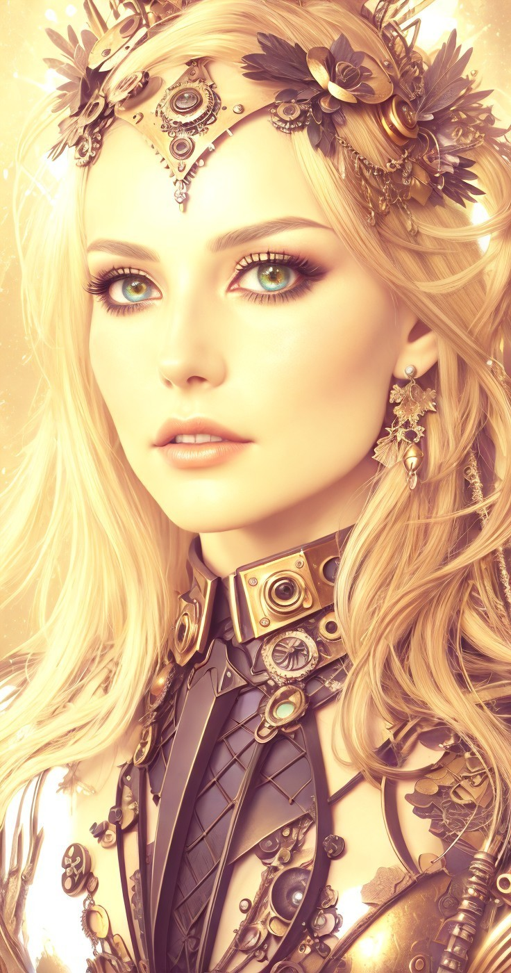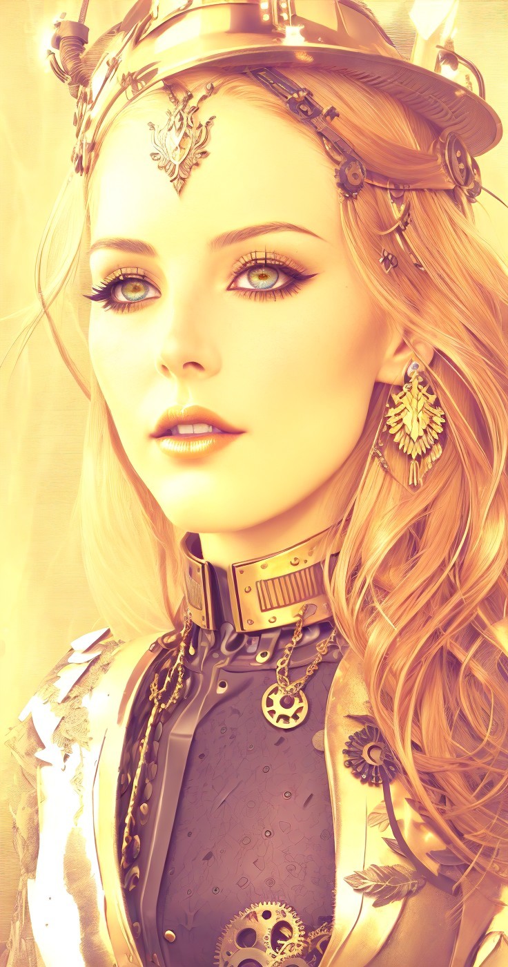 An illustration of a woman with striking eyes, wearing ornate metallic headgear and armor with intricate detailing and gears.