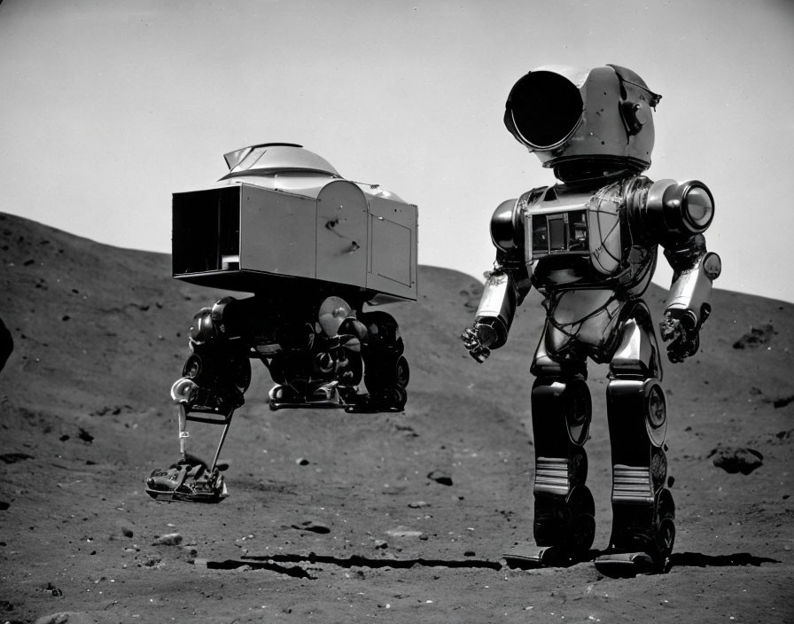 Prompt: Space Explorer Investigating excavating the fossils of an ancient robot, circa 1950, retrofuturistic, retrofuturism, vintage, monochromatic photography, space suit, vintage, look of the 1950s, black and white picture