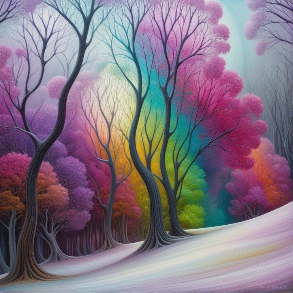 A whimsical forest scene features stylized trees with vibrant pink, purple, and orange foliage. The landscape is soft and dreamy, with a gradient sky and a sparkling foreground.