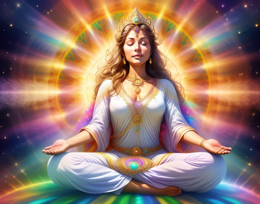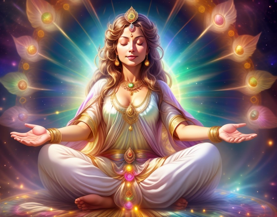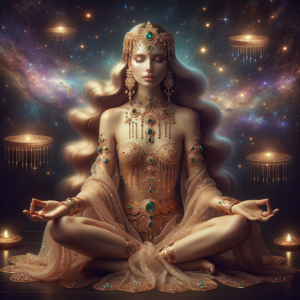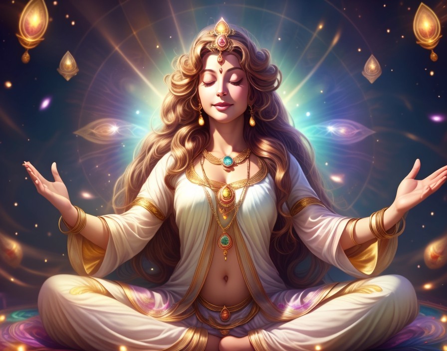 An artistic depiction of a multi-armed goddess with ornate gold jewelry, meditating amidst glowing celestial lights.