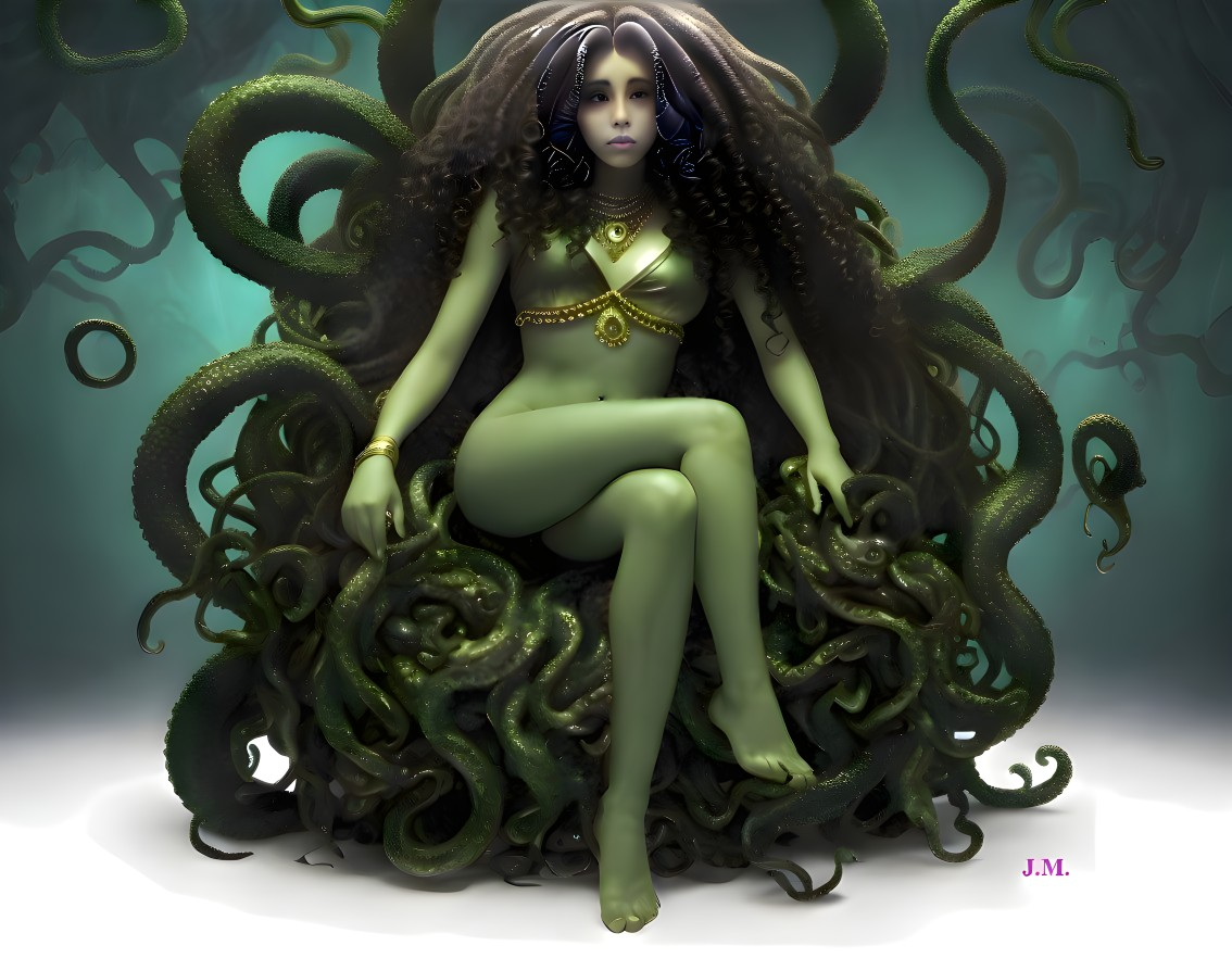 Medusa adorned with gold, sits on a throne with Cthulhu surrounding her.