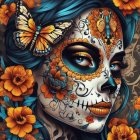 A woman adorned with vibrant makeup and butterfly motifs, surrounded by lush foliage. Her intricate face paint features bold designs, while she wears ornate jewelry and a captivating expression.