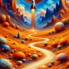 In a surreal landscape, a winding path leads through vibrant orange hills. Above, a giant globe hovers, emitting light. Two figures walk, exploring this fantastical world filled with planets.