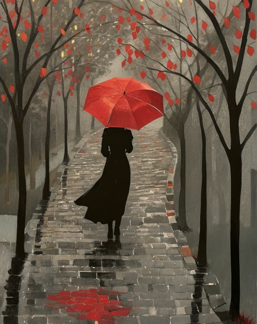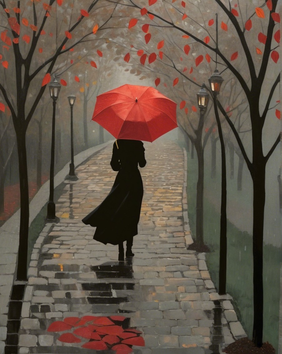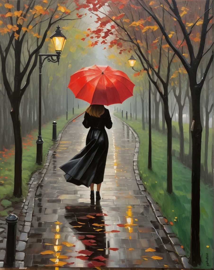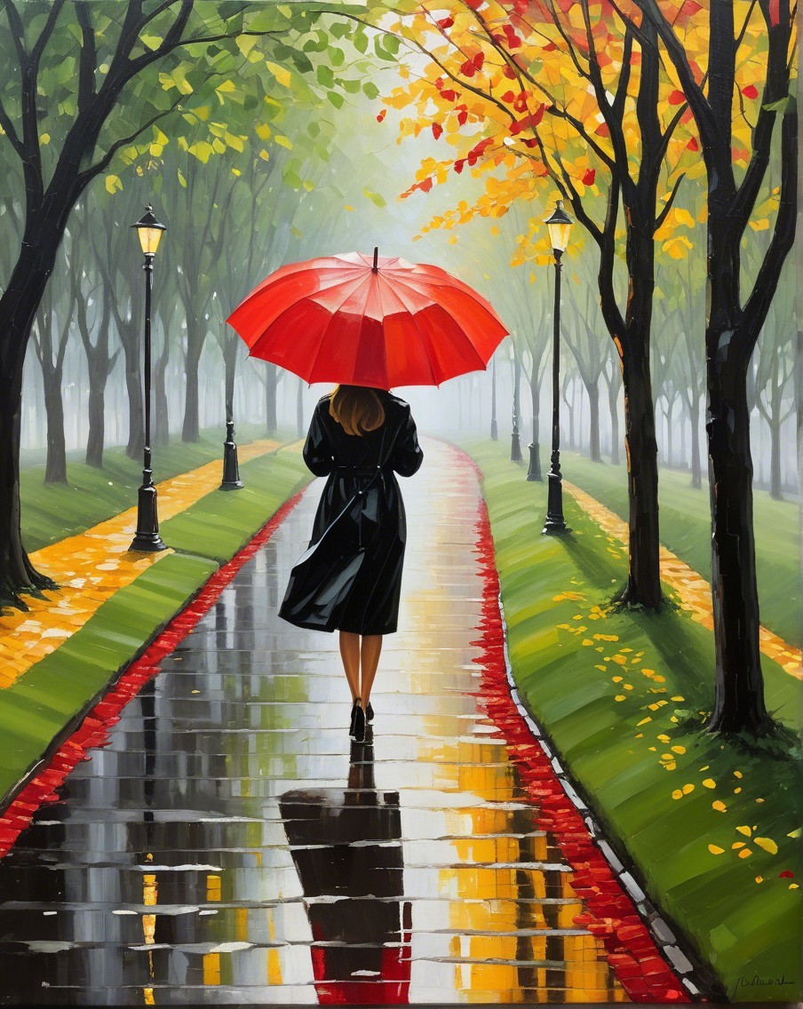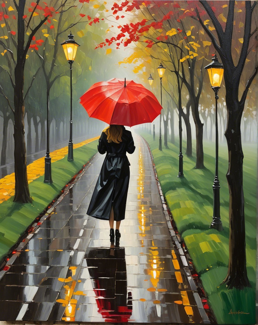A woman in a green coat walks down a rainy, colorful path with an umbrella and red handbag, surrounded by vibrant autumn leaves and softly glowing street lamps.