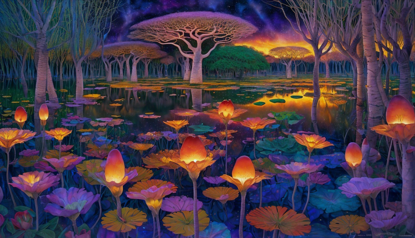A vibrant, mystical landscape at twilight with luminous flowers, a reflective pond, starry sky, and whimsical trees.