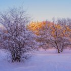 A serene winter scene features charming, snow-covered buildings with warm hues at dusk. A large, bare tree stands in the foreground, while people stroll through the pristine white landscape.