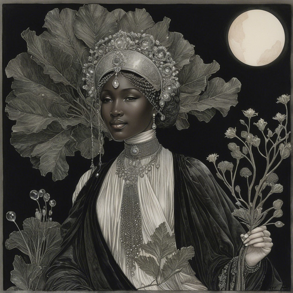 A regal figure adorned in elegant clothing holds a large parasol. She wears intricate jewelry and a crown, set against a dark background with a glowing moon and a delicate butterfly nearby.