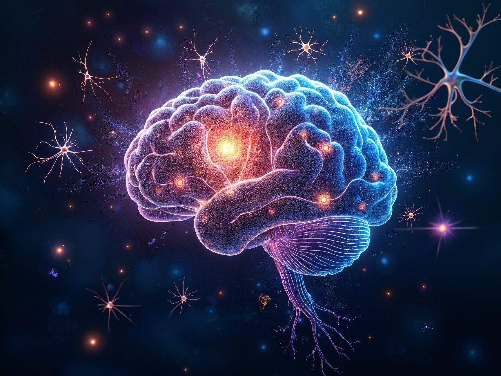 A vibrant, abstract depiction of a brain intertwined with all cosmic elements