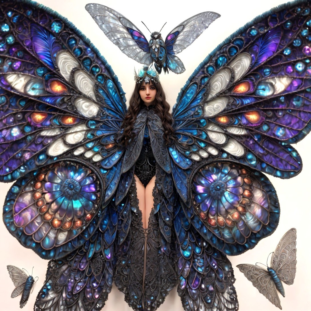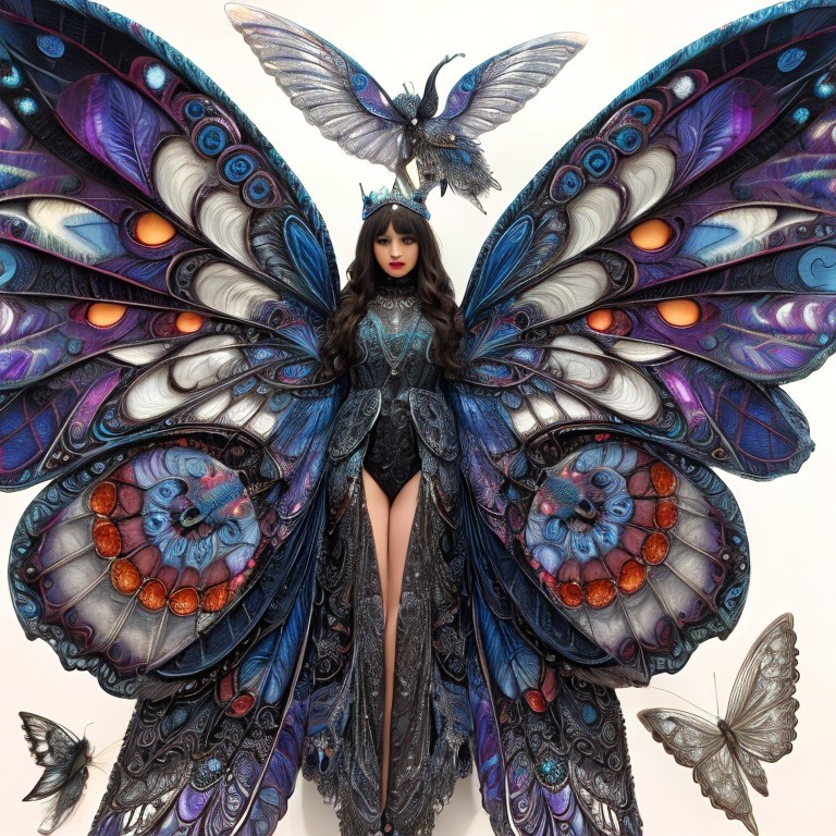 A woman with elaborate butterfly wings and blue attire is surrounded by butterflies, creating a mystical and enchanting scene.