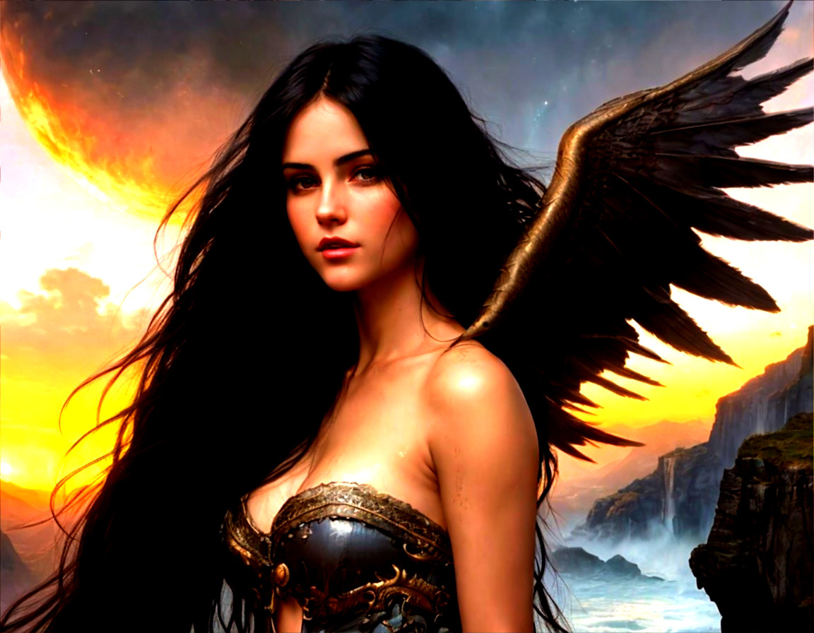 A stunning artwork featuring a beautiful woman with long black hair in a bathing suit riding a fiery dragon over a surreal village at sunset. The masterpiece boasts cinematic lighting, intricate details, and vivid contrasts, creating a breathtaking and captivating scene.