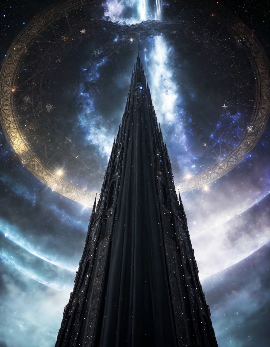 Prompt: add dramatic cosmic lights and increase depth, low angle shot of a dark wizard's sky-high tower made of shiny smooth black-glitter glass with a radiant magical silver star at the top, sparkly cosmic sky with dramatically shimmering stars, opulent, dark fantasy, masterpiece, dark, high fantasy art, very detailed, michael whelan, keith parkinson, very high quality, dramatic lighting