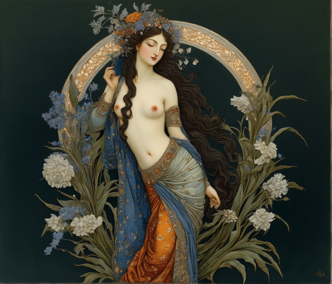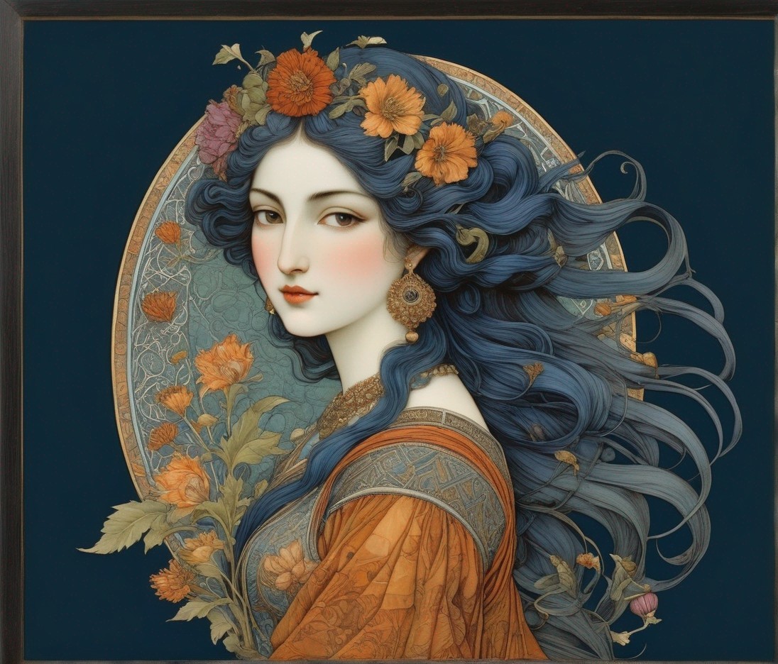 Nymph of flowers. 3rd century Persian miniature art, indigo, copper, eggshell, plum, silver, sage green, paprika, Velvet Black, Shabby, Dull Gold, Amber Gray, Golden Ratio, Surreal Fantasy, Elegant, High Definition Ultra Fine 3D Line, Zenangle Style, Watercolor Patchwork , Arthur Rackham Style, Paul Kidby, , Jacek yerka, Extremely Detailed, Intricate, Thoughtful, HDR, Fractal, Beautiful, Award Winning, Fantasy Look, Fantasy, Crisp Quality Modifiers:Kamal al-Din Bihzad