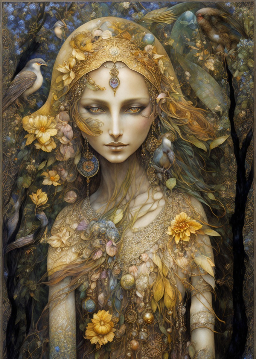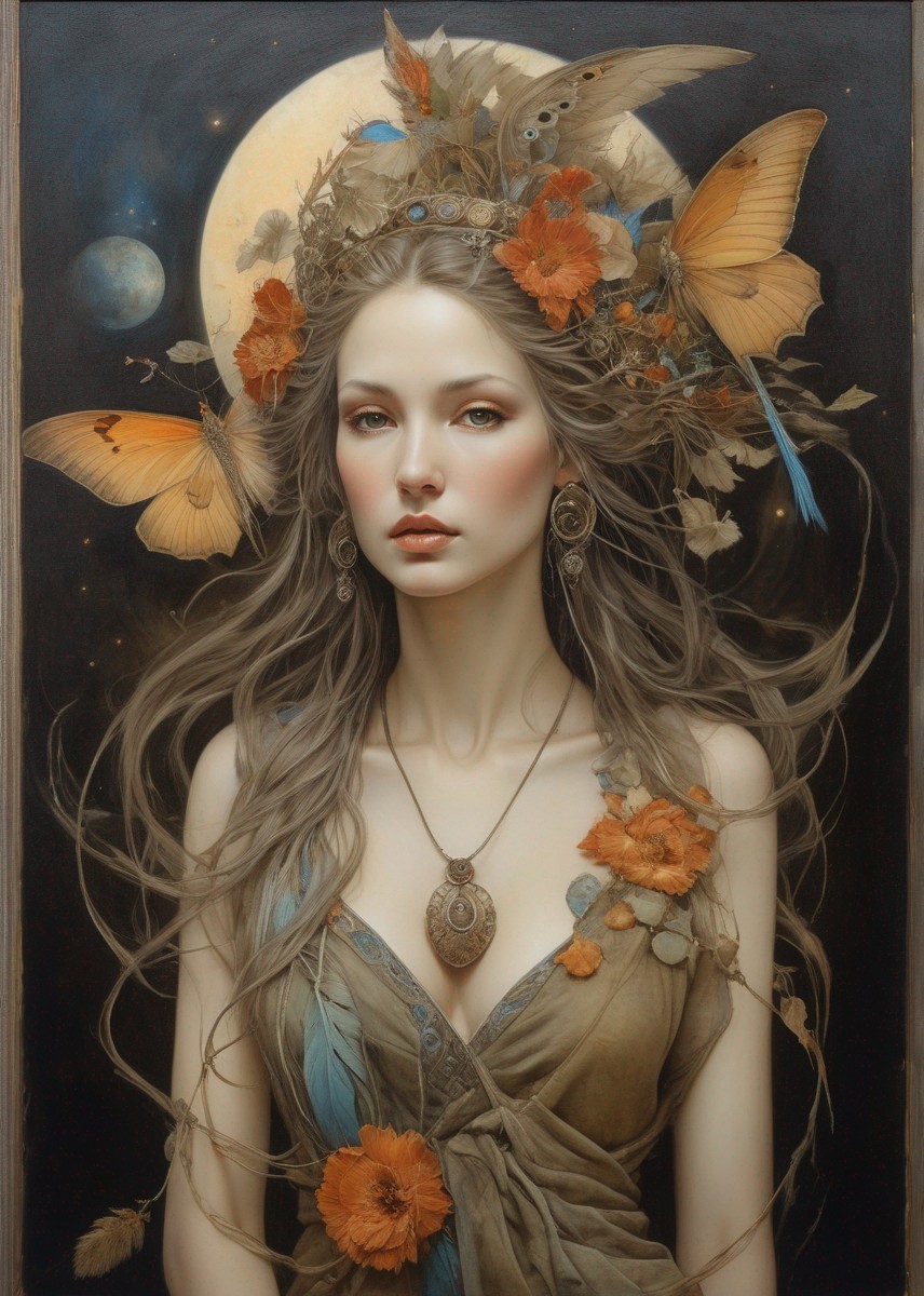 An ethereal woman with an ornate bird-feather headdress and a serene expression, adorned with a jeweled necklace and pendant.