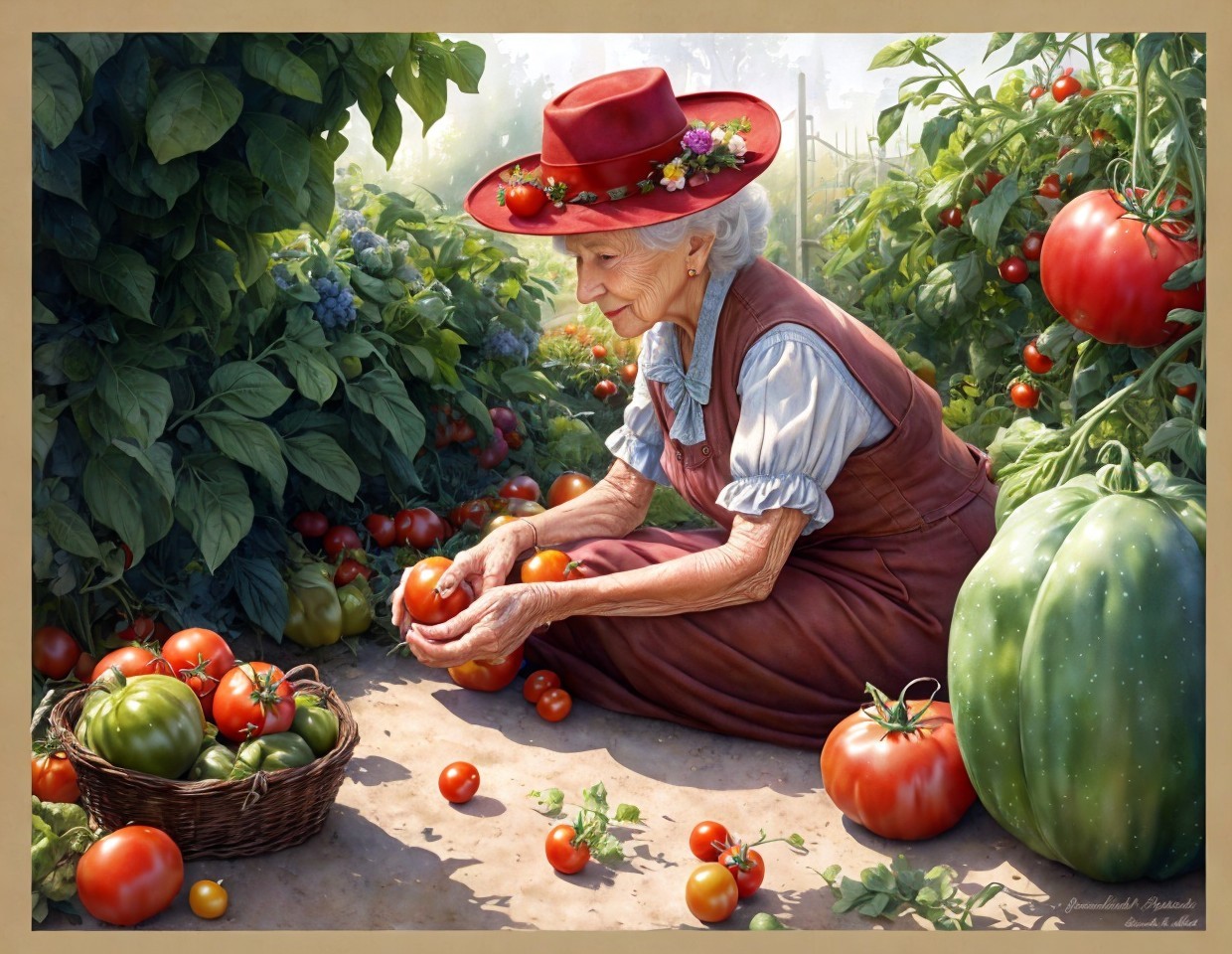 An elderly woman in a straw hat and apron sits in a sunny garden, surrounded by lush plants and harvested pumpkins, cutting beans.