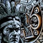 A fierce warrior adorned with intricate jewelry and tribal tattoos stands against a vibrant mural, showcasing rich cultural symbols and expressions of heritage. His gaze is intense and commanding.