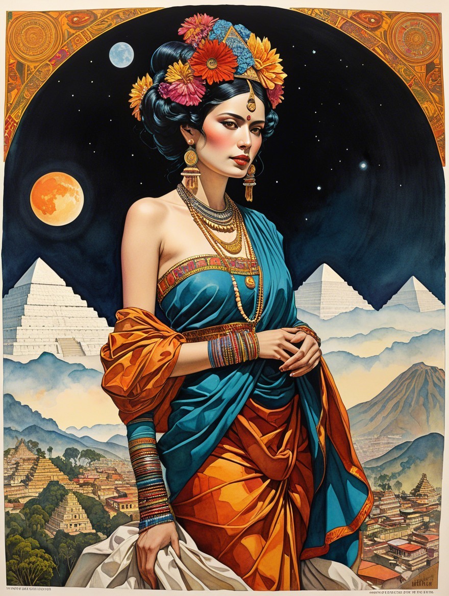 + Prompt:Chimaltenango guatemala pyramid sol shine traditional dress Style: Möbius, Daniel Merriam, Egon Schiele, Alphonse Mucha, Anna Dittman, illustration
