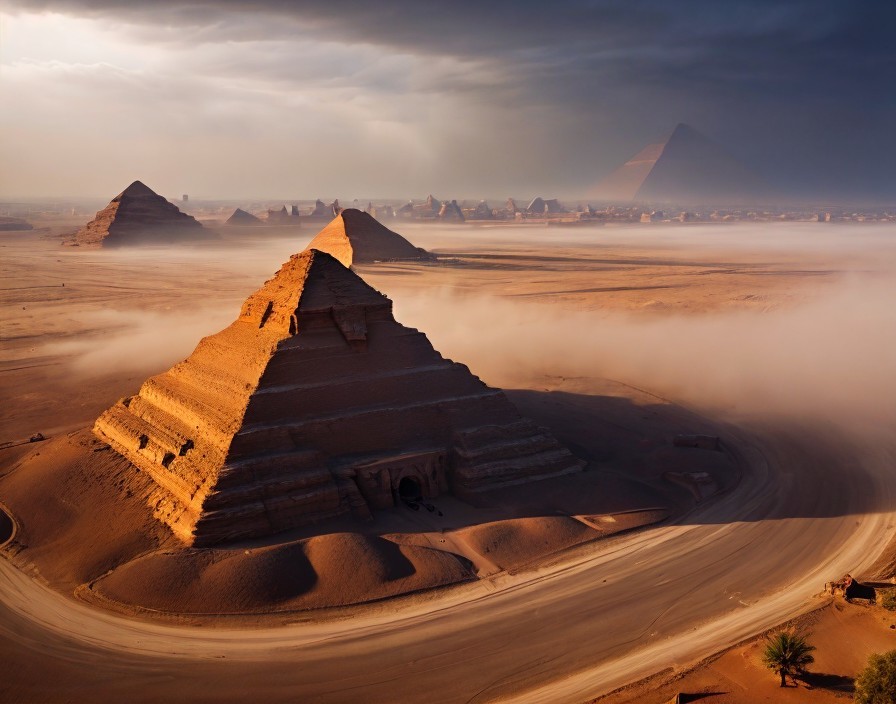 Sand-covered pyramidal structures in desert with sunlit clouds and dust storm