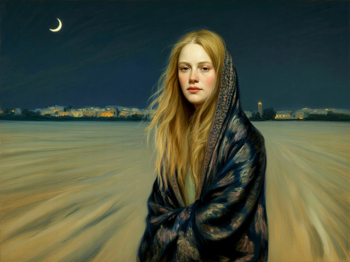 An oil painting of a young woman with long blonde hair and pale skin, wearing a dark patterned head covering and wrap, standing at night in the wind on sandy open ground, with a lighted Moroccan town in the background, and a new moon overhead.
