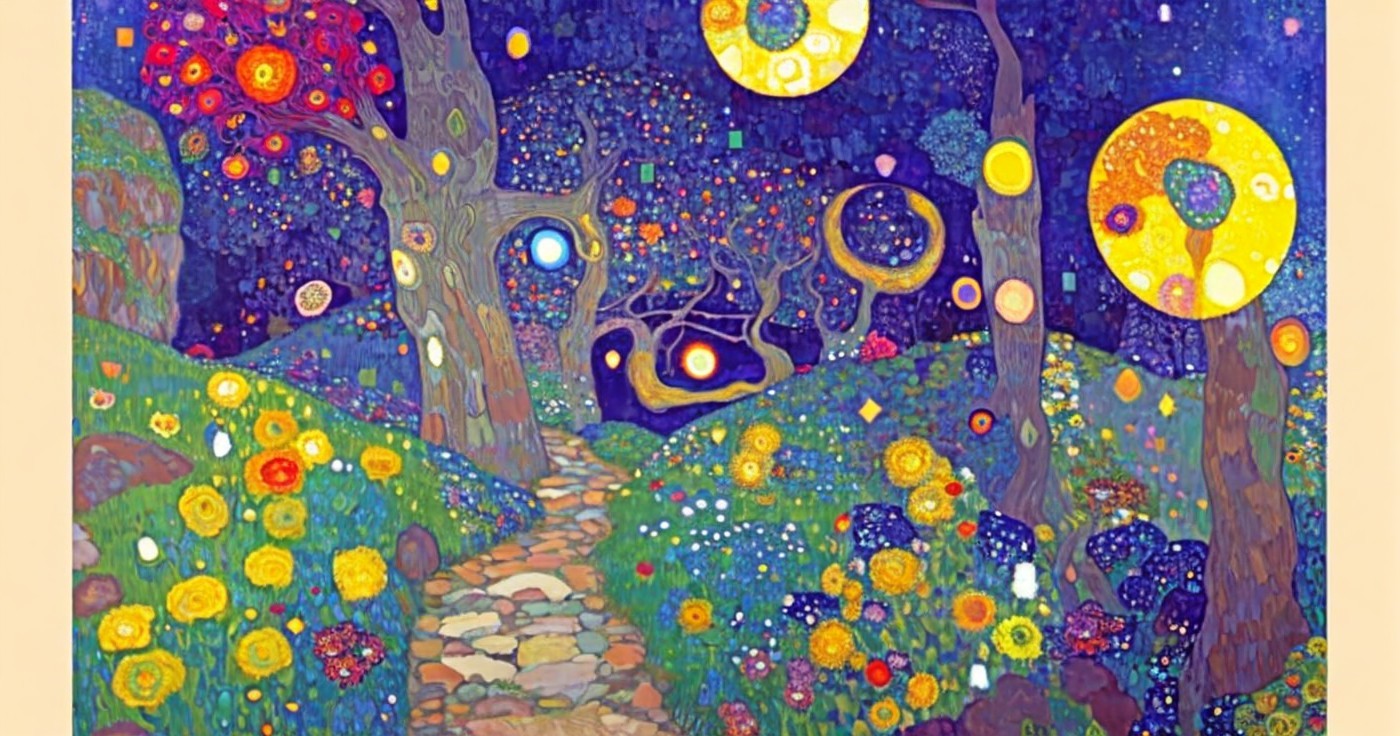 A vibrant landscape features a winding path flanked by colorful flowers, set against a starry sky with swirling galaxies and celestial orbs. Majestic mountains rise in the background.