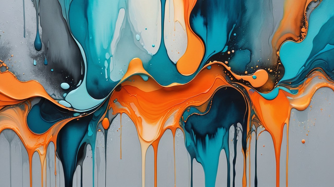The artwork features a vibrant blend of blue, orange, and teal hues, with fluid shapes and drips creating a dynamic, abstract composition that evokes movement and energy.