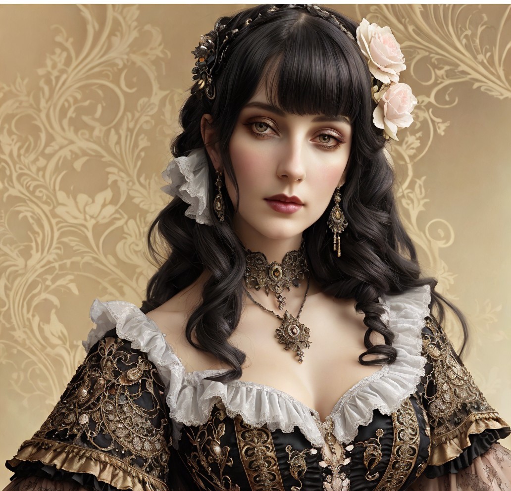 Beautiful Temptress in victorian gowns, upper body portraiture in watercolor and ink, inkpunk 1.8, ethereal Renaissance style, edwardian clothing , baroque details, gothical fantasy art, highly detailed ornamental features, glossy, hues, plasticity 1.9, complexion 1.4, radiance, bioluminescent details, gothical background, psychpomp, grunge, brightness 1.4 ,shadow mapping 1.3, dynamic lighting 1.7, colorful iridescence, magical realism, stylized illustration 1.8, ochre rim lighting, anisotropic filtering 1.7, ambient occlusion 1.9, triadic color scheme beige grey black, ochre rim lighting, golden ratio, vector 13:9, high coloring 1.9, bokeh effects,