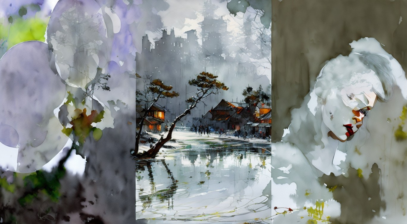This image features three artistic panels: a stylish woman with striking features, a moody cityscape reflecting water, and another elegant woman, all in a blend of monochrome and soft colors.