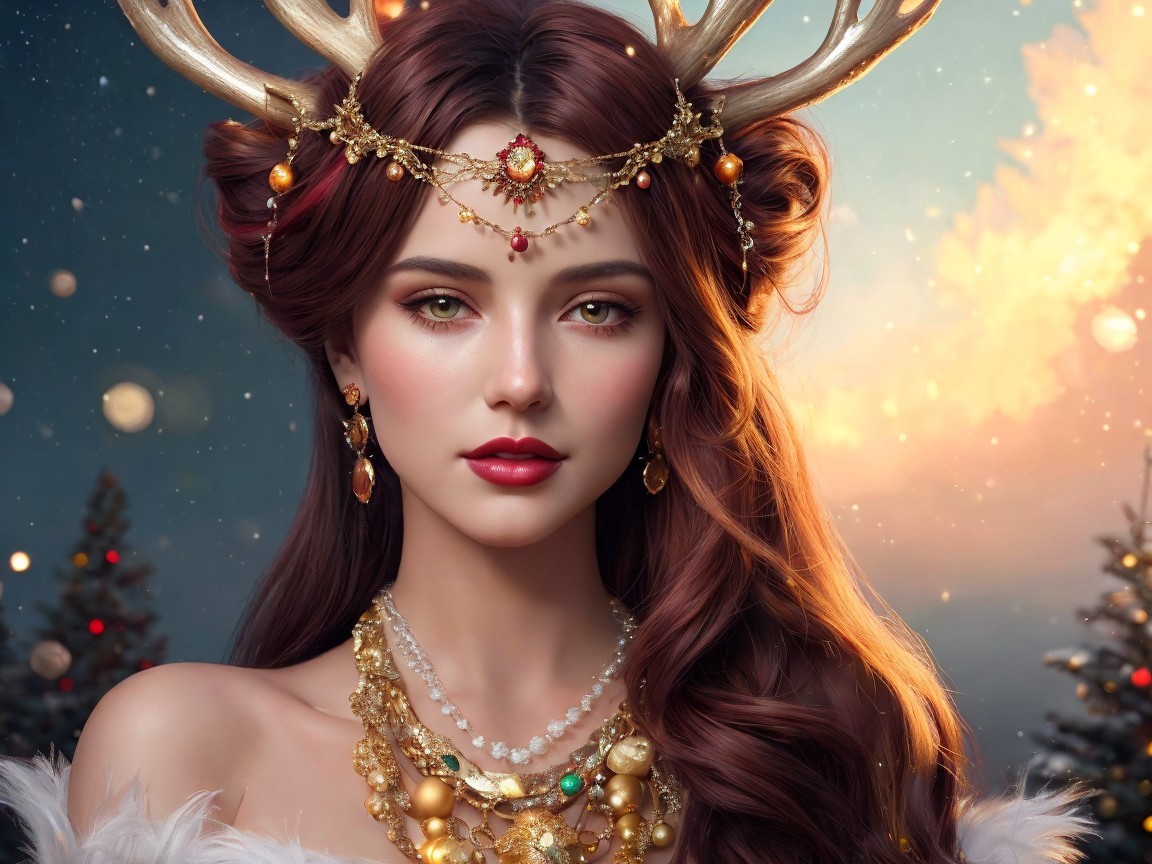 Prompt: "Prompt: Style of Art Deco. Portrait. Full Body. A auburn wild-haired christmas fairy with antlers and dressed in white and maroon layered with gold chains and jewels, set on a night sky background."