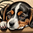 A realistic illustration of a cute, laid-back puppy with expressive brown eyes and a shiny black and brown coat, resting its head on a wooden surface near a plant.