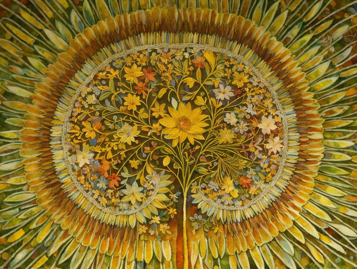 An intricate floral mosaic forming a circular pattern with a variety of earthy tones and detailed petal designs.