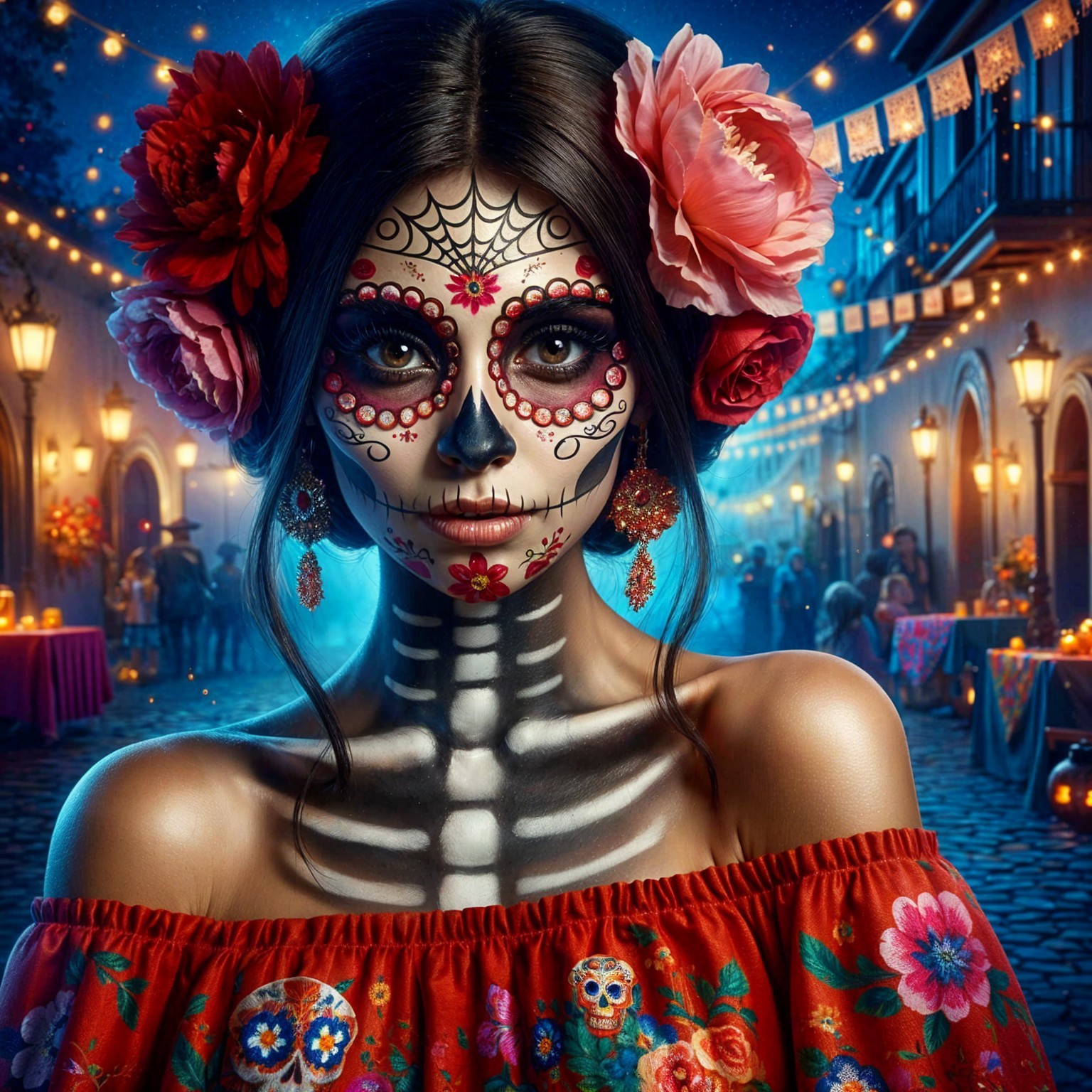 Prompt: "A stunning illustration of a woman in vibrant traditional Day of the Dead (Día de los Muertos) makeup with intricate floral and skeletal designs painted on her face. She has large, expressive eyes and is wearing a red off-shoulder dress decorated with colorful patterns. Her dark hair is styled elegantly with red and pink flowers woven through it. The background is a festive, warmly lit Mexican street at dusk with candles, lanterns, and blurred lights, creating a soft and mystical atmosphere. The scene feels lively yet respectful of cultural traditions"