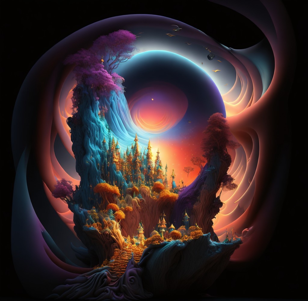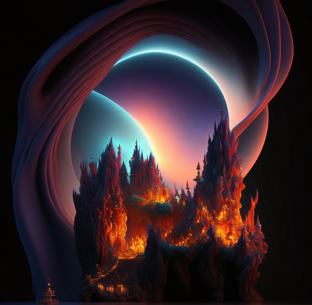 Fantasy landscape featuring illuminated castle, vibrant trees, floating rock, crescent moon, and glowing planet