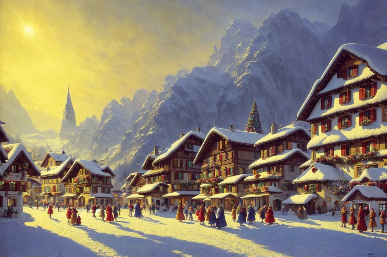 252525:[a highly detailed painting of a swiss village in Winter, Christmas tree on the village square, many people on the market square]{fantasy Scifi Art by Bruce Pennington and combinate with Paint Art by Robert Nesser. Deph of field, soft shadow and 3D shading, volumetric light and 3Delight, High detailed Artwork, 4K, 8K, Incredibly Detailed Composition}