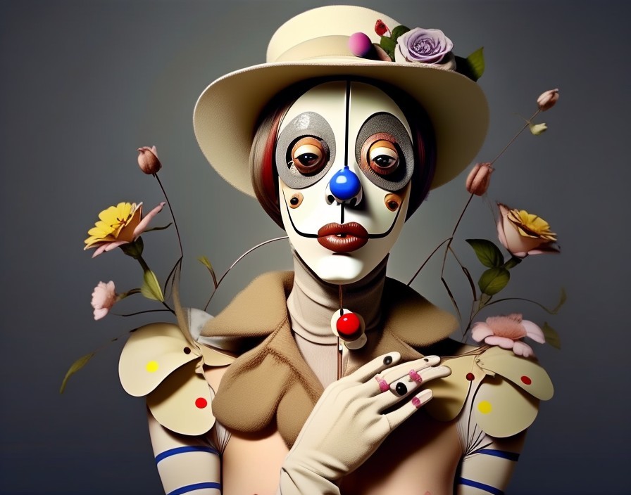 Stylized Clowns in Vintage Attire with Intricate Makeup