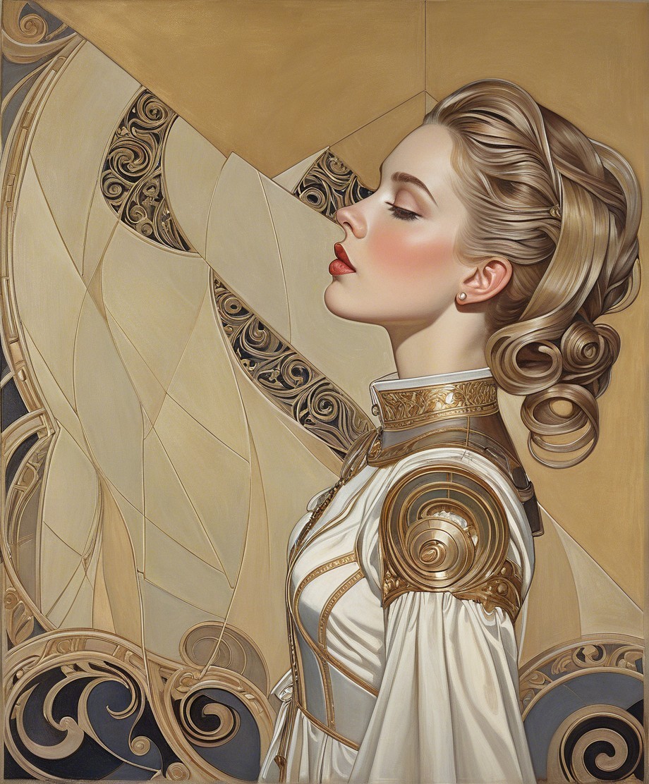 Portraiture in style of Joseph Christian Leyendecker, Oil on canvas, reminiscent of stirybook Illustration, Side view, teenage Temptress, wispy gold filaments, contouring outlines by Susan Seddon Boulet, cel-shaded, dethereal, flowing hair illusion, tessellated, geometrical, only curves, symmetrical, aesthetic integrity of lines and shapes, line-art features, small reflections, dyed, estranged metallic colors, push processing technique, stippled, stylized rounded edges, back-lit, squiggly line-art features, stylized lineage drawing, nuanced, serene, quaint, bokeh effects, Fantasy details, triadic color scheme beige red auburn, high coloring, plasticity 1.3, precious, precise Gelsculpt 64K, parallax occlusion 1.2, raytraced shadows 1.8, divisionism, plasticity, sculpted, baroque, overall composition by Georgia o'keffee and Arlie Opal,