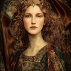 A regal angel with flowing red hair and a golden crown gazes serenely. She wears a dark, ornate garment, complemented by intricate jewelry, exuding an ethereal and majestic presence.