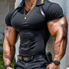 A muscular man poses confidently in a form-fitting black shirt, showcasing his impressive physique. He wears tactical pants and accessories, set against a textured wall in an outdoor setting.