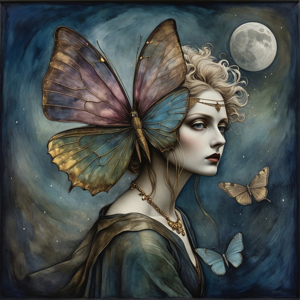 A mystical figure with butterfly wings adorned with blue and purple hues stands against a night sky, featuring two glowing moons. Her elegant attire and floral crown enhance the enchanting scene.