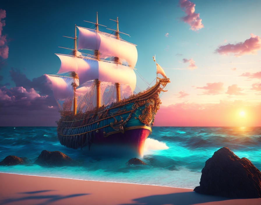 An ornate sailing ship with billowing sails approaches the shore against a vibrant sunset sky.