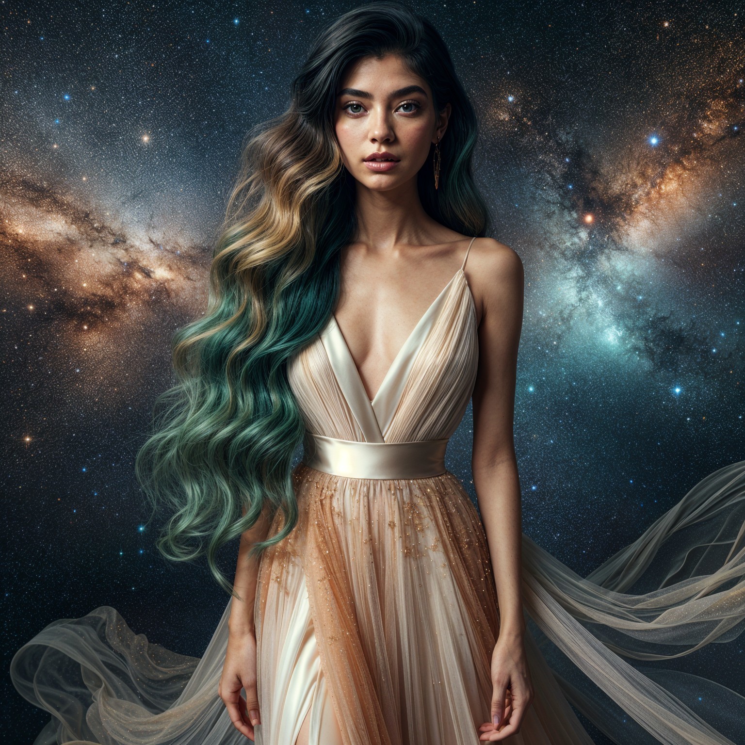A young woman with curly hair and freckles wears a stunning blue gown adorned with intricate floral embroidery. The backdrop features a mesmerizing galaxy, enhancing her ethereal presence.