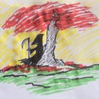 A cloaked figure stands beside a vibrant red tree under a soft yellow sky. The scene blends nature and a sense of mystery, evoking themes of life and death.
